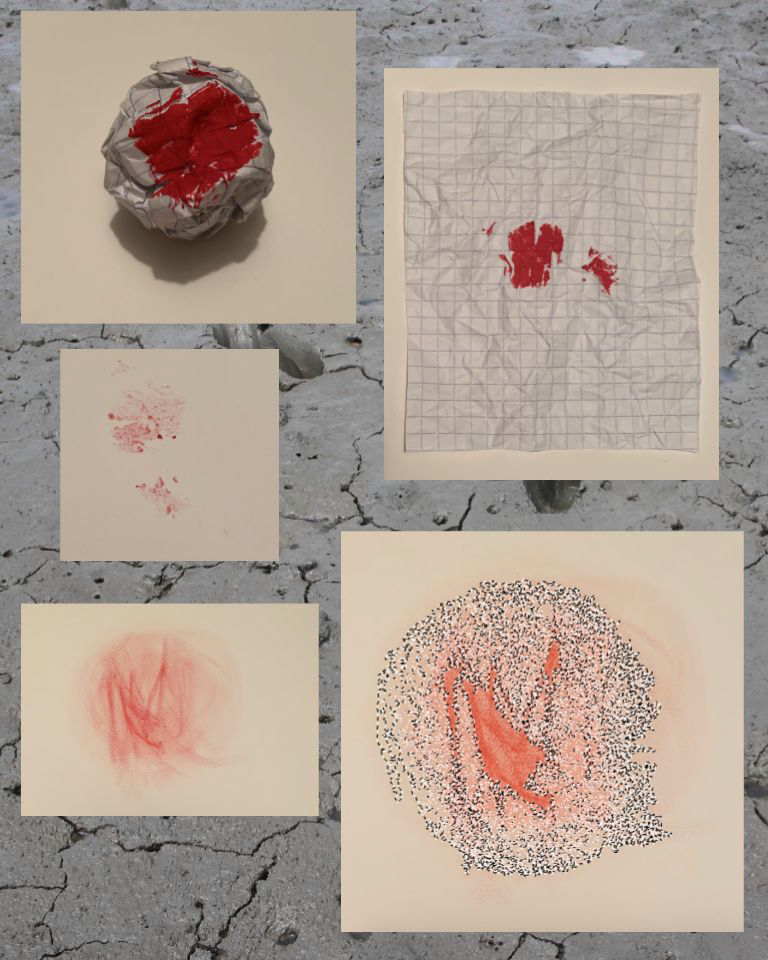 In my research I study efforts in South Korea to quantify and govern the distribution of carbon throughout vast intertidal mudflats located on the country’s western coastline. This work has made me interested in questions surrounding national territorial formations and how global flows of carbon, capital, and power as well as specific types of techno-scientific/legal practices shape territorial imaginaries and condition experiences of/notions of sovereignty at both individual and state levels. Most fundamentally, my graphic creation aims to underscore the point made by several scholars that the notion of territory is best conceived as an act or practice rather than an object or mere physical extension of the state. Additionally, it seeks to explore both the expressive and functional dimensions of territorial forms. I began by balling a sheet of graph paper up into a sphere, marking its surface with a pastel the way countries may be marked on globes, and then unfurled the sphere to see how this flat and relatively tidy territorial marking would splinter after the dense, wrinkled foldings that kept the sphere’s shape came apart. Next, I transferred this new territorial shape from the gridded graph paper to a blank and less-defined space by pressing the unfurled pastel marking onto a blank sheet of paper. Next, I smeared this newly printed territorial form in a more impressionistic style, loosely aiming to recreate the spherical shape I began with. Lastly, I photographed this impressionistic sphere, imported it into Preview’s photo-editing program, and, using the magic wand tool, allowed variations of contrast across pixel color values to delineate new territorial forms (pictured via the fuzzy black and white lines) and took a screenshot of this process. After all of this, I photographed critical steps in this process and layered these images atop a photograph of the surface of an intertidal mudflat relevant to my research. While my arrangement of these images can be read sequentially, I purposefully wanted to leave some ambiguity in this sequential reading to underscore the ongoing, processual, and non-teleological nature of territorialization and re-territorialization practices.